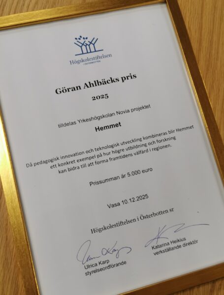 Yrkeshögskolan Novia belönas för sin satsning inom området intelligenta system med Göran Ahlbäcks pris som delas ut av Högskolestiftelsen i Österbotten. Priset delas ut från Göran Ahlbäcks fond som inrättades 2022. Priset på 5 000 euro ges till Novias simuleringsutrymme ”Hemmet” på Alere inom hälsa och välfärd. Utmärkelsen delas ut 10.12.2025 vid Novia i Vasa.